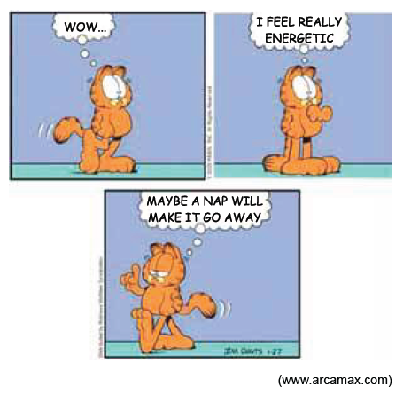 No terceiro quadro, há uma quebra de expectativa, pois Garfield sugere tirar uma soneca para “fazer essa energia ir embora” (“MAYBE A NAP WILL MAKE IT GO AWAY”).