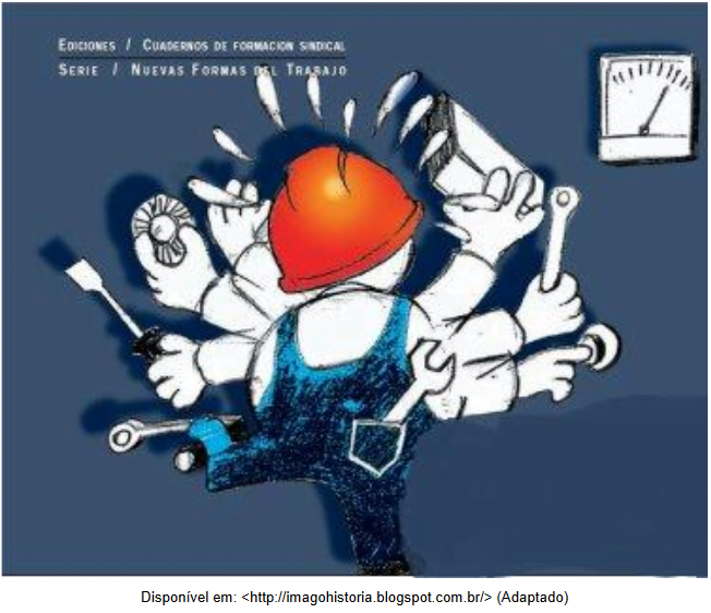 (UPE/2017) A partir dos anos 1970, o sistema de produção fordista começou a entrar em crise, pois a superprodução gerou uma diminuição acentuada da lucratividade. Como alternativa,surge,no Japão,um novo sistema de trabalho capitalista, que possui como modelo produtivo a flexibilização da produção. Além de reordenar as relações de trabalho, esse novo sistema produtivo permitiu o avanço tecnológico em muitas áreas. A imagem a seguir representa umnovo tipo de trabalhador exigido por esse sistema de produção capitalista das sociedades modernas.