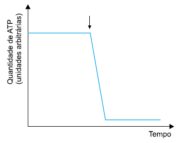 A partir do ponto indicado por X observa-se uma drástica redução na produção de ATP, indicando que as leveduras deixaram de realizar o metabolismo aeróbio e passaram a realizar o processo anaeróbio (fermentação alcoólica). Neste processo há formação de CO2 e etano (C2H5OH), além de um saldo energético de 2 ATP’s.