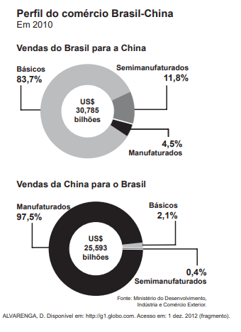 A análise dos gráficos revela que o Brasil exportou uma maior quantidade de matéria-prima básica, as chamadas commodities, para a China, enquanto esta exportou para o Brasil quase que exclusivamente produtos manufaturados.