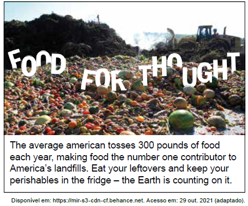No trecho “making food the number one contributor to America’s landfills” (tornando os alimentos o principal contribuinte para os aterros sanitários da América) tem-se a ideia central do cartaz, que chama a atenção para o grande desperdício de alimentos, que acabam degradando o ambiente (o lixão gera chorume, que contamina o solo e os lençóis freáticos, além de ser um local de grande proliferação de insetos e outros animais que podem transmitir doenças; isso sem falar na poluição visual e nos problemas sociais que podem ocorrer com a instalação de um lixão).