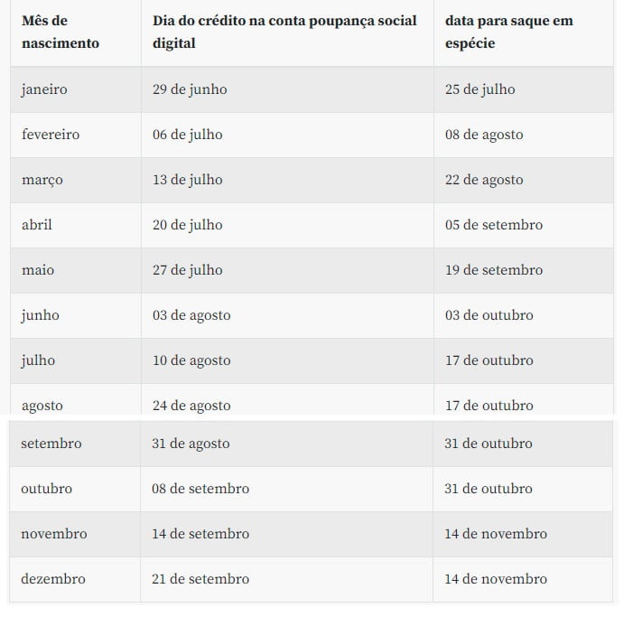 O dinheiro será liberado para saque ou transferência para outra conta bancária, a partir de 14 de novembro, para os trabalhadores nascidos em dezembro. O calendário de crédito na conta poupança digital e de saques foi estabelecido com base no mês de nascimento do trabalhador.