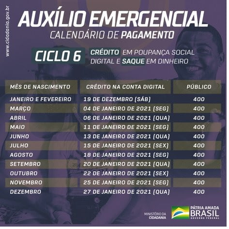 Calendário Auxílio Emergencial ciclo 6 crédito e saque