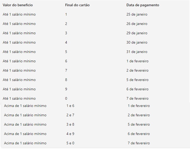 Para consultar a data de pagamento, você deve observar o número final do seu cartão de benefício, sem considerar o último dígito verificador após o traço.