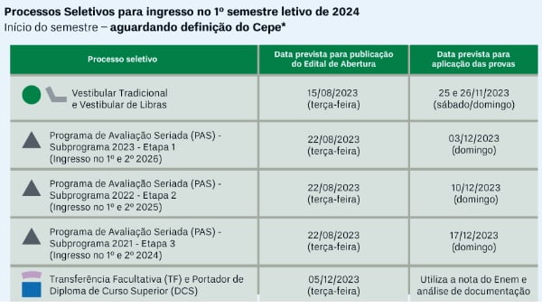 A Universidade de Brasília (UnB) divulgou o cronograma dos processos seletivos para ingresso, em 102 cursos de graduação presenciais, os quais são oferecidos pela instituição, nos semestres letivos de 2º/2023, 1º/2024 e 2º/2024.