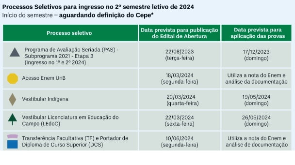 - Para quem se tornará calouro a partir de agosto de 2024, as seleções serão lançadas, majoritariamente, no mês de março do próximo ano: Acesso Enem UnB (18/03/24), Vestibular Indígena (20/03/24) e Vestibular para Licenciatura em Educação do Campo (22/03/24). Transferência Facultativa e Portador de Diploma de Curso Superior fecham as oportunidades para o segundo semestre letivo, com edital no ar em 10 de junho de 2024.