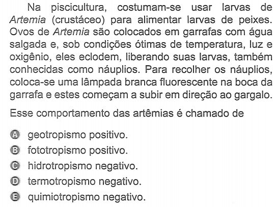A atração das artêmias pela luz é um caso de fototropismo positivo.