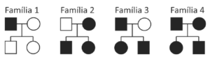 Os heredogramas representam quatro famílias, em que ocorrem pessoas com surdez (símbolos escuros).