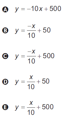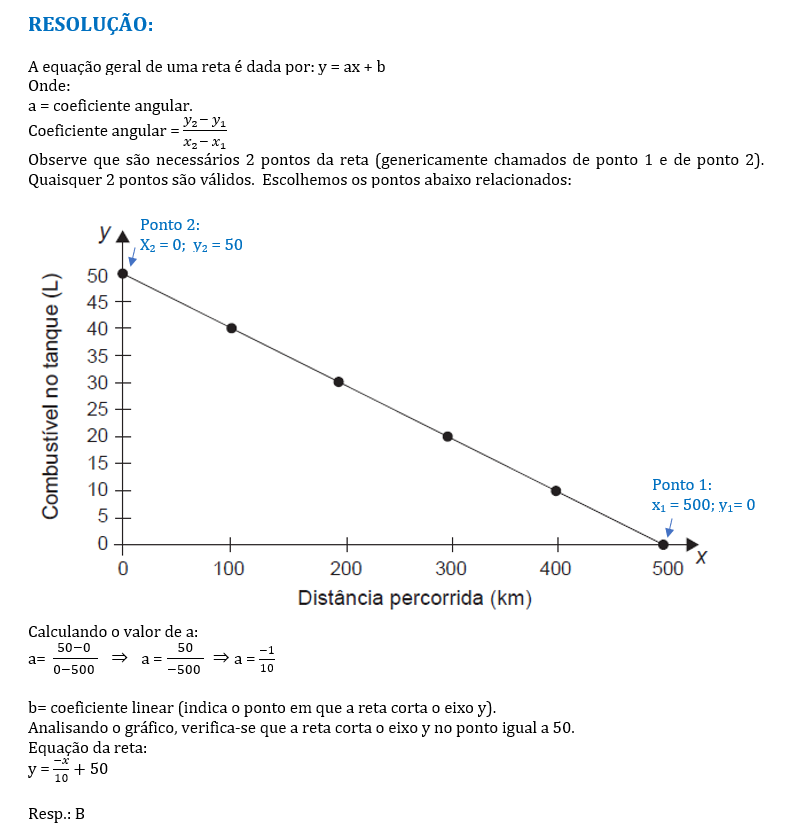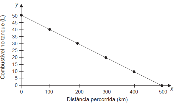 (Enem/2018 – PPL) Uma indústria automobilística está testando um novo modelo de carro. Cinquenta litros de combustível são colocados no tanque desse carro, que é dirgido em uma pista de testes até que todo o combustível tenha sido consumido. O segmento de reta no gráfico mostra o resultado desse teste, no qual a quantidade de combustível no tanque é indicada no eixo y (vertical), e a