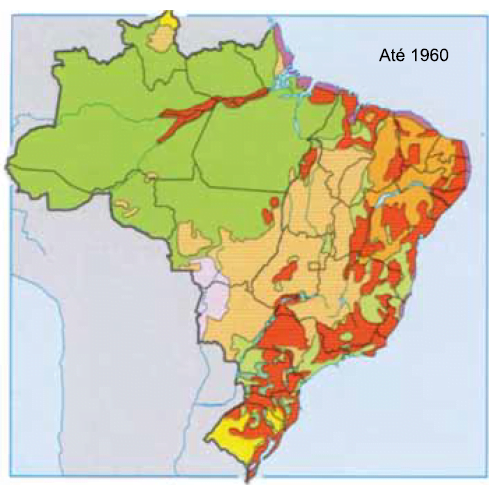 O mapa mostra a ocupação humana no Brasil, comparando-a até 1960 e entre 1960 e 2000.