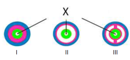 A letra X representada nos 3 esquemas refere-se ao tubo digestório do animal, formado a partir do arquêntero (que ocorre na fase gástrula). Dentre os 3 esquemas acima, apenas o III indica um animal celomado. O celoma corresponde ao espaço em branco, que aparece contornado pela cor rosa.