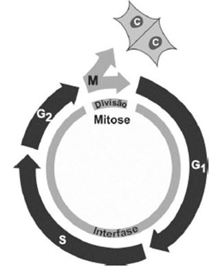 (FUVEST/2013)  Na figura abaixo, está representado o ciclo celular. Na fase S, ocorre síntese de DNA; na fase M, ocorre a mitose e, dela, resultam novas células, indicadas no esquema pelas letras C.