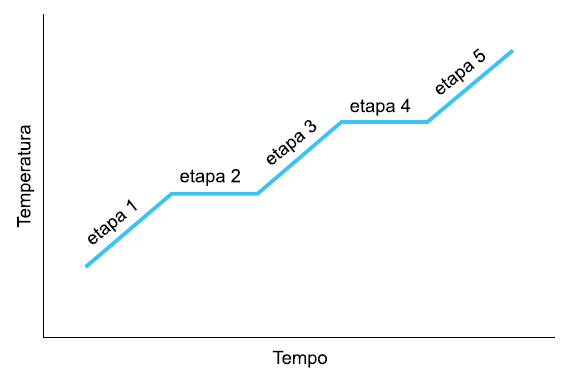 Uma substância pura tem sua temperatura constante durante a fusão e a ebulição. Dessa forma, no gráfico acima, em 2 e em 4 está ocorrendo a mudança de estado físico. No caso acima, em 2 está ocorrendo a fusão (em 1 o sólido está em aquecimento), em 3 o líquido está em aquecimento; em 4 está ocorrendo a ebulição e em 5 tem-se o aquecimento do vapor.