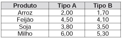 Verifica que se aproveita 100% da quantidade adquirida de produtos do tipo A, mas apenas 90% de produtos do tipo B. Esse comerciante deseja comprar uma quantidade de produtos, obtendo o menor custo/benefício em cada um deles. O quadro mostra o preço por quilograma, em reais, de cada produto comercializado.