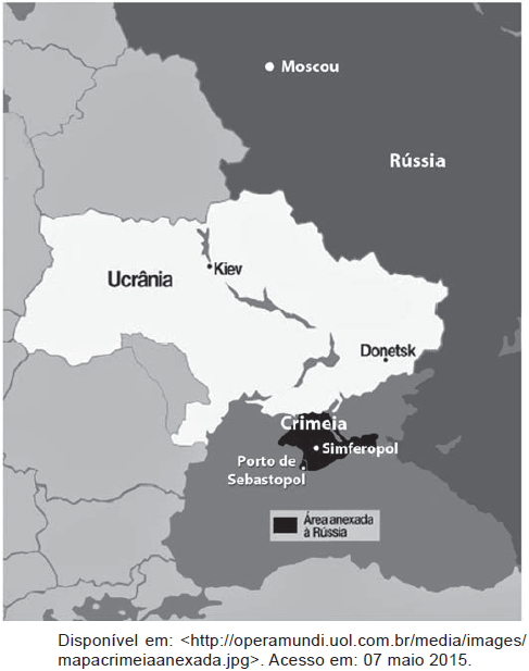 A anexação à Rússia da região ucraniana destacada na imagem provocou a seguinte situação geopolítica: