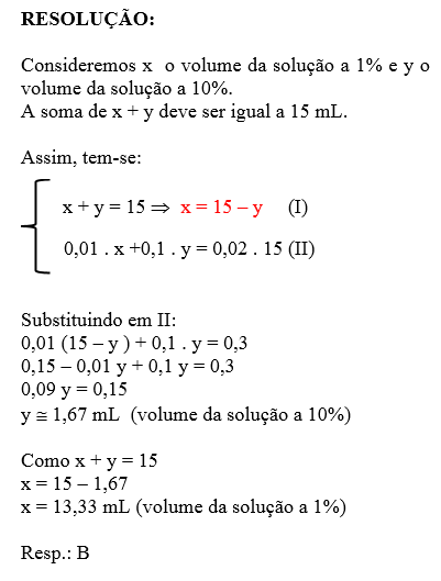 (SL Mandic/2017) Um farmacêutico precisa preparar uma receita, com 15 mL de um colírio, contendo 2% de um ingrediente ativo. Entretanto ele tem em seu estoque apenas soluções a 10% e a 1%, desse ingrediente.