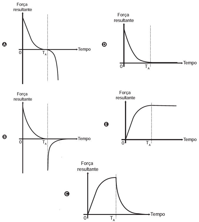 (Enem/2013) Em um dia sem vento, ao saltar de um avião, um paraquedista cai verticalmente até atingir a velocidade limite. No instante em que o paraquedas é aberto (instante TA), ocorre a diminuição de sua velocidade de queda. Algum tempo após a abertura do paraquedas, ele passa a ter velocidade de queda constante, que possibilita sua aterrissagem em segurança.