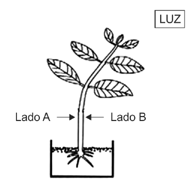 (PUC- Campinas/2018) Nas plantas o crescimento caulinar ocorre na direção da fonte de luz, num movimento denominado fototropismo positivo, resultante da ação de hormônios vegetais. Na figura abaixo a planta foi colocada sob luz unidirecional; o lado A corresponde à porção sombreada do caule e o lado B à iluminada.