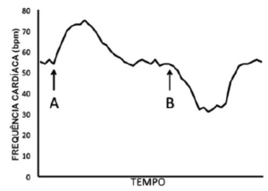 (Campo Real/2018) Durante a realização de um experimento, um pesquisador manteve o coração de um anfíbio isolado e perfundiu-lhe duas substâncias, A e B, para observar o efeito sobre a frequência cardíaca. A figura ao lado apresenta os resultados, indicando o momento da perfusão de cada substância.