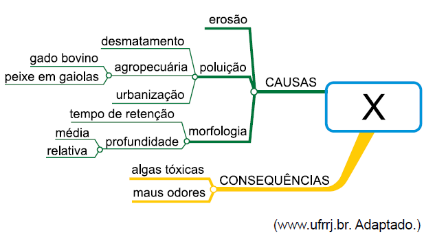 O esquema apresentado mostra a poluição de corpos d’água por componentes orgânicos, trazendo como consequência a proliferação de algas e, por conseguinte, a liberação de odores desagradáveis no meio – o que caracteriza o fenômeno da eutrofização.