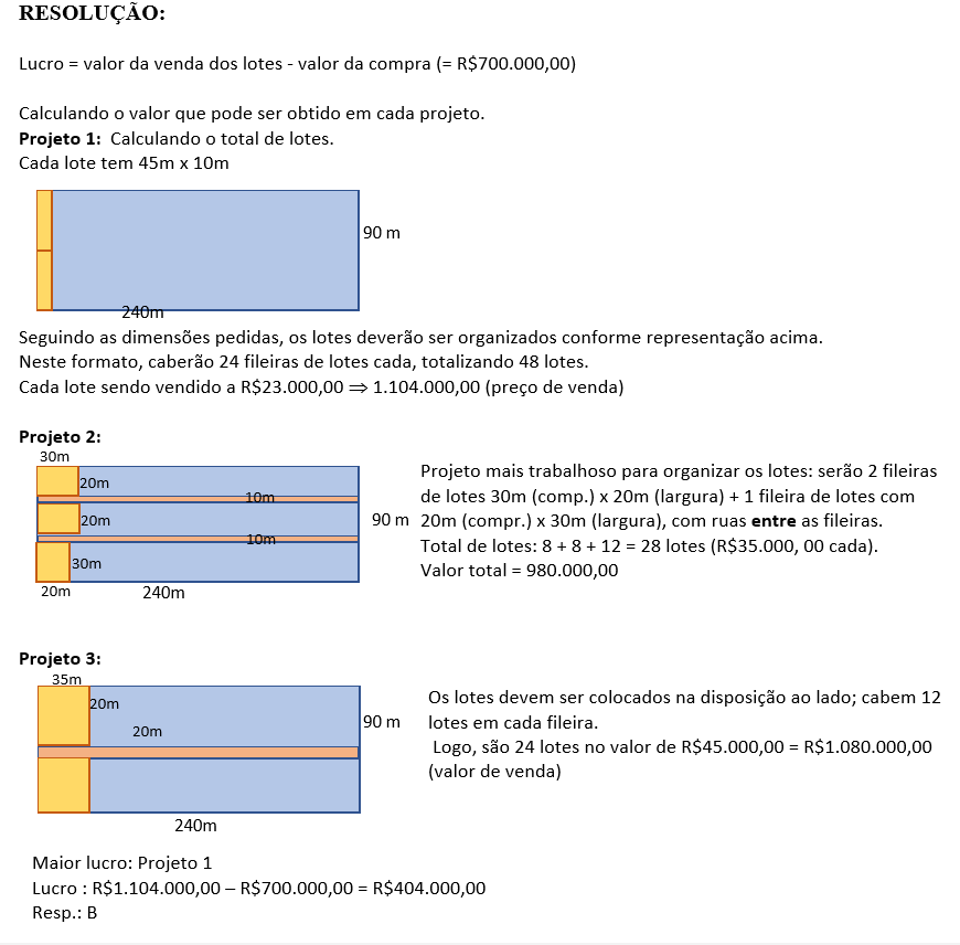 Projeto 2: dividir o terreno em lotes iguais de 20 m x 30 m, deixando entre lotes ruas de 10 m de largura e 240 m de comprimento, e vender cada lote por R$35.000,00.