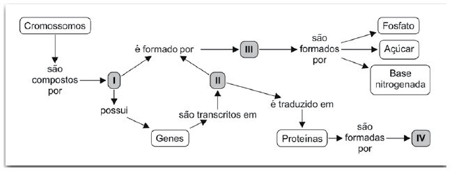 Os cromossomos são formados por DNA (I), molécula que sofre transcrição originando RNA (II). Tanto o DNA quanto o RNA são formados por nucleotídeos (III). O RNA é traduzido em moléculas de proteínas, formadas por aminoácidos (IV).