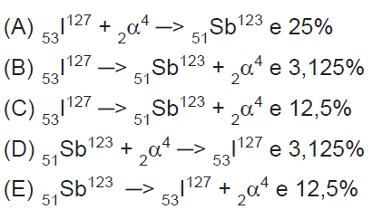 Para se obter iodo 124 (124I) usando a partícula alfa (2α4) como um dos reagentes, o outro reagente deverá ter uma massa igual a 123u. (127 – 4), o que aparece somente na opção D.