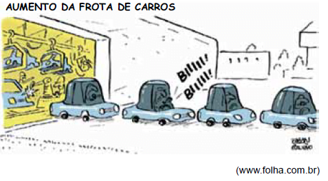 A charge apresenta uma fileira de carros, aparentemente se acumulando e emitindo sons de buzina (“Biii! Biii!”), o que sugere uma situação de congestionamento, comum em áreas urbanas com grande quantidade de veículos.