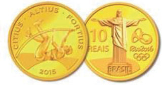(Unifeso/2016) Uma das moedas comemorativas dos Jogos Olímpicos e Paralímpicos Rio 2016, lançadas pelo Banco Central, homenageia