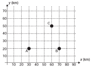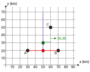 (Enem/2013) Nos últimos anos, a televisão tem passado por uma verdadeira revolução, em termos de qualidade de imagem, som e interatividade com o telespectador. Essa transformação se deve à conversão do sinal analógico para o sinal digital. Entretanto, muitas cidades ainda não contam com essa nova tecnologia. Buscando levar esses benefícios a três cidades, uma emissora de televisão pretende construir uma nova torre de transmissão, que envie sinal às antenas A, B e C, já existentes nessas cidades. As localizações das antenas estão representadas no plano cartesiano: