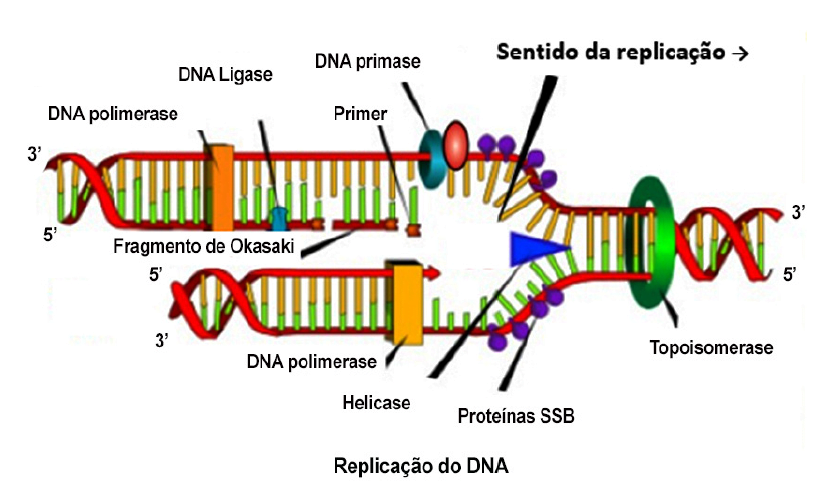 Para que ocorra a duplicação do DNA, após o rompimento das ligações de hidrogênio pela helicase, a enzima DNA polimerase adiciona nucleotídios à nova fita, respeitando o pareamento (A com T; C com G).