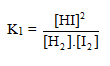 Como a concentração de HI é muito maior que a de H2 e de I2 no equilíbrio, o valor de K1 será maior que 1.