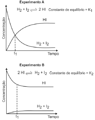 (Fuvest/2013) A uma determinada temperatura, as substâncias HI, H2 e I2 estão no estado gasoso. A essa temperatura, o equilíbrio entre as três substâncias foi estudado, em recipientes fechados, partindo-se de uma mistura equimolar de H2 e I2 (experimento A) ou somente de HI (experimento B).
