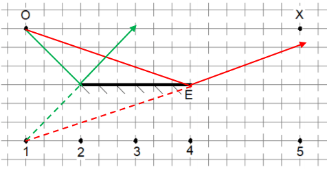 (UFRGS/2019) Na figura abaixo, O representa um objeto puntual luminoso; E representa um espelho plano e X um observador.