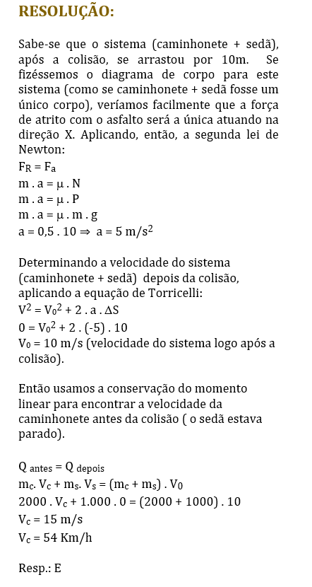 sedã, de massa 1.000 kg, que estava parado no semáforo, em uma rua horizontal. Após o impacto, os dois veículos deslizaram como um único bloco. Para a perícia, o motorista da caminhonete alegou que estava a menos de 20 km/h quando o acidente ocorreu. A perícia constatou, analisando as marcas de