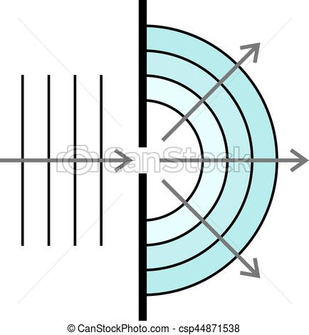 Ao encontrar uma fenda, a onda sonora é capaz de atravessá-la (os raios de onda fazem uma curva após passar pela fenda, conforme mostra a imagem abaixo –> é a difração).