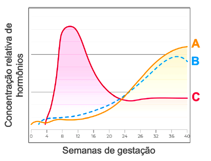 A curva A, que mantém uma variação relativamente baixa até o final da gestação, representa o estrógeno,  hormônio que  aumenta sua taxa de forma mais significativa no terceiro trimestre, preparando o corpo para o parto e a lactação.
