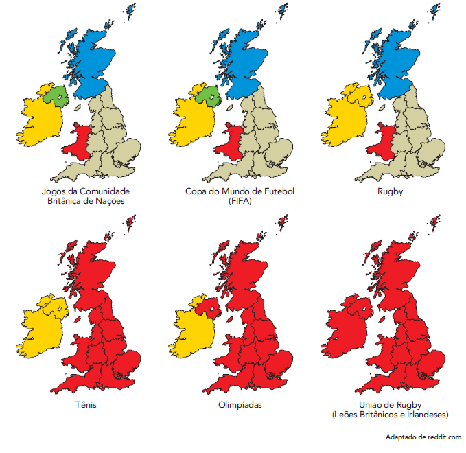 Nações: O texto da questão destaca o conceito de “Estados plurinacionais” (Estados formados por mais de uma nação). O Reino Unido é o exemplo clássico abordado na imagem. Ele é composto por quatro “nações” ou países constituintes, que possuem identidades culturais e históricas próprias e, como mostram os mapas (especialmente o da FIFA e o dos Jogos da Comunidade Britânica), frequentemente competem de forma independente em eventos esportivos. São elas: Inglaterra, Escócia, País de Gales e Irlanda do Norte