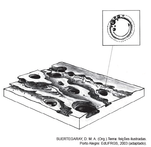 Uma análise da figura revela que se trata de um processo erosivo causado por águas em redemoinhos ( turbilhonares), com presença de sedimentos ( seixos e areias).