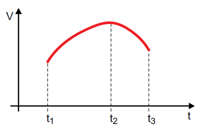 Entre t1 e t2, a velocidade aumenta em função do tempo, o que indica a ocorrência de uma aceleração positiva. Por outro lado, entre t2 e t3, a velocidade diminui em função do tempo, o que indica a ocorrência de uma aceleração negativa neste intervalo de tempo.