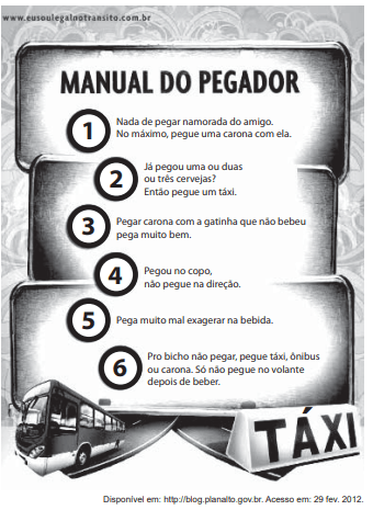 Anúncios publicitários geralmente fazem uso de elementos verbais e não verbais. Nessa peça publicitária, a imagem, que simula um manual, e o texto verbal, que faz uso de uma variedade de língua específica, combinados, pretendem