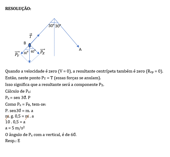 se pendura na extremidade de um cipó esticado, formando um ângulo de 30° com a vertical, e inicia, com velocidade nula, um movimento pendular. Do outro lado do rio, a pessoa se solta do cipó no instante em que sua velocidade fica novamente igual a zero. Imediatamente antes de se soltar, sua aceleração tem