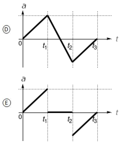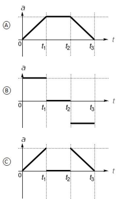 (Pism/2019) Um teste de um carro esportivo foi realizado em uma pista longa, lisa, plana e reta. O carro partiu do repouso em t igual a zero foi uniformemente acelerado até um instante t1, foi mantido com velocidade constante entre os instantes t1 e t2 e, a partir de t2, paraquedas traseiros foram acionados para frear o carro, em um movimento uniformemente desacelerado, até parar no instante t3. Selecione a alternativa que contém o gráfico que representa corretamente a aceleração do carro em função do tempo.