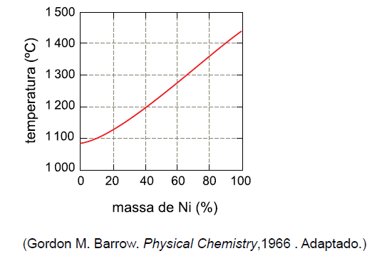 (Univag/2017-2) O gráfico mostra a variação da temperatura de início de fusão de ligas Ni-Cu em função da porcentagem em massa de Ni.