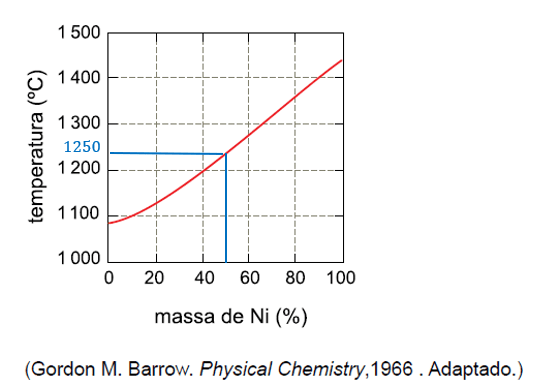 Analisando o gráfico, verifica-se que o ponto de fusão de uma liga Ni-Cu com 50% de níquel é de aproximadamente 1250 ºC, conforme mostrado no gráfico abaixo.