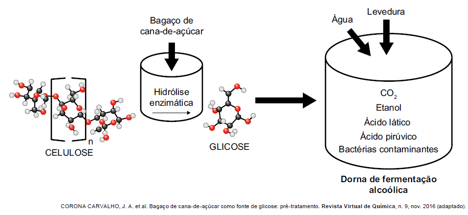 (Enem/2023 – PPL) O etanol de segunda geração envolve o reaproveitamento dos resíduos do bagaço da cana e sua produção ocorre em um sistema fechado contínuo, que evita a evaporação. A figura ilustra esse processo.