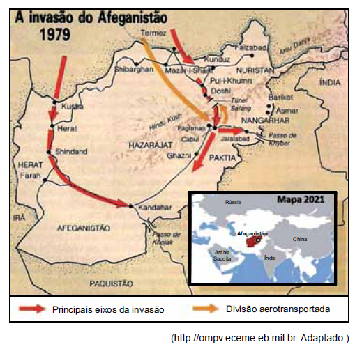 O principal elemento para resolver a questão está no próprio título do mapa: “A invasão do Afeganistão 1979“. Em dezembro de 1979, a União Soviética (URSS) invadiu o Afeganistão. O objetivo era apoiar o governo afegão de orientação comunista, que estava perdendo o controle do país para grupos guerrilheiros islâmicos (os mujahidin). Essa invasão ocorreu no contexto da Guerra Fria. Para a URSS, manter um governo aliado no Afeganistão era fundamental para garantir sua esfera de influência na Ásia Central e evitar a propagação do extremismo islâmico em suas próprias repúblicas vizinhas.