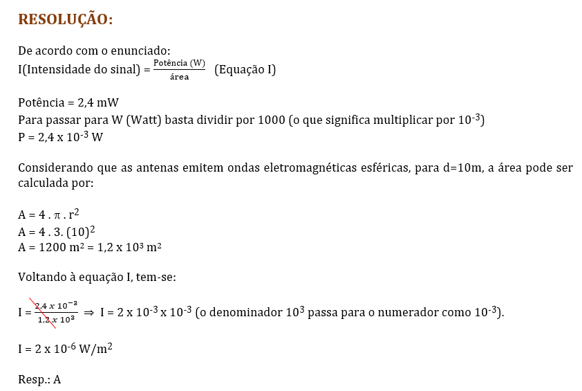 (Enem/2023) O bluetooth é uma tecnologia de comunicação sem fio, de curto alcance, presente em diferentes dispositivos eletrônicos de consumo. Ela permite que aparelhos eletrônicos diferentes se conectem e troquem dados entre si. No padrão bluetooth, denominado de Classe 2, as antenas transmitem sinais de potência igual a 2,4 mW e possibilitam conectar dois dispositivos distanciados até 10 m. Considere que essas antenas se comportam como fontes puntiformes que emitem ondas eletromagnéticas esféricas e que a intensidade do sinal é calculada pela potência por unidade de área. Considere 3 como valor aproximado para π. Para que o sinal de bluetooth seja detectado pelas antenas, o valor mínimo de sua intensidade, em W/m2 , é mais próximo de