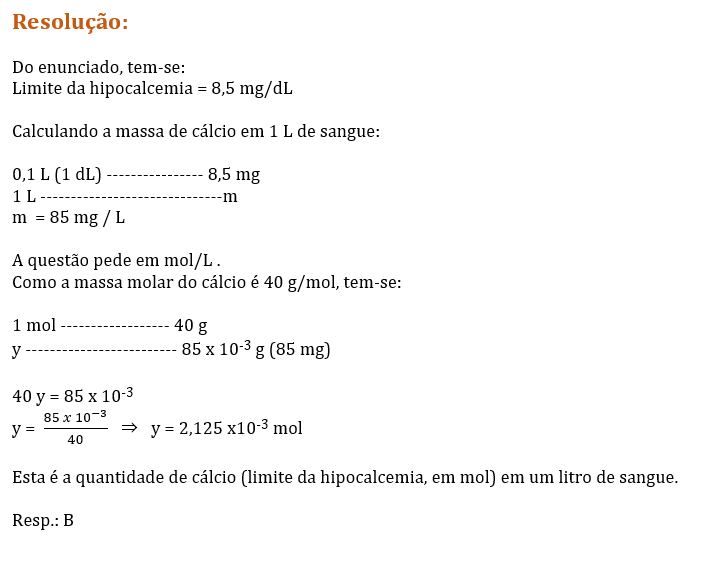 (Fema/2024 – Medicina) As soluções de cloreto de cálcio (CaCl2) podem ser administradas a pacientes que sofrem de hipocalcemia, uma deficiência nutricional caracterizada por um nível de cálcio (massa molar = 40 g/mol) total no sangue com uma concentração limite de 8,5 mg/dL (1 dL = 0,1 L).