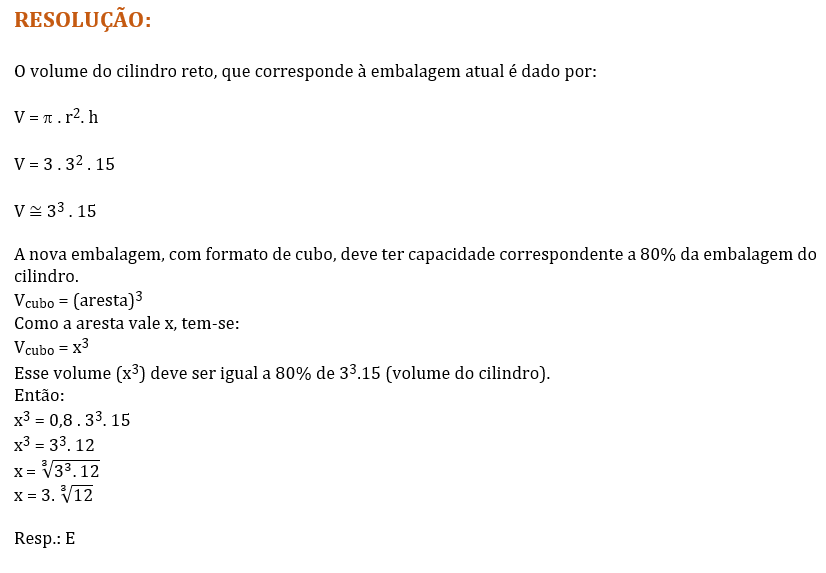 (Enem/2024) Em uma empresa é comercializado um produto em embalagens em formato de cilindro circular reto, com raio medindo 3 cm, e altura medindo 15 cm. Essa empresa planeja comercializar o mesmo produto em embalagens em formato de cubo, com capacidade igual a 80% da capacidade da embalagem cilíndrica utilizada atualmente.